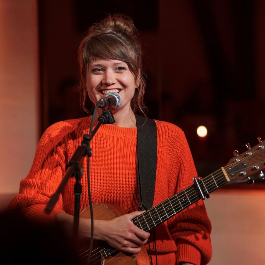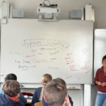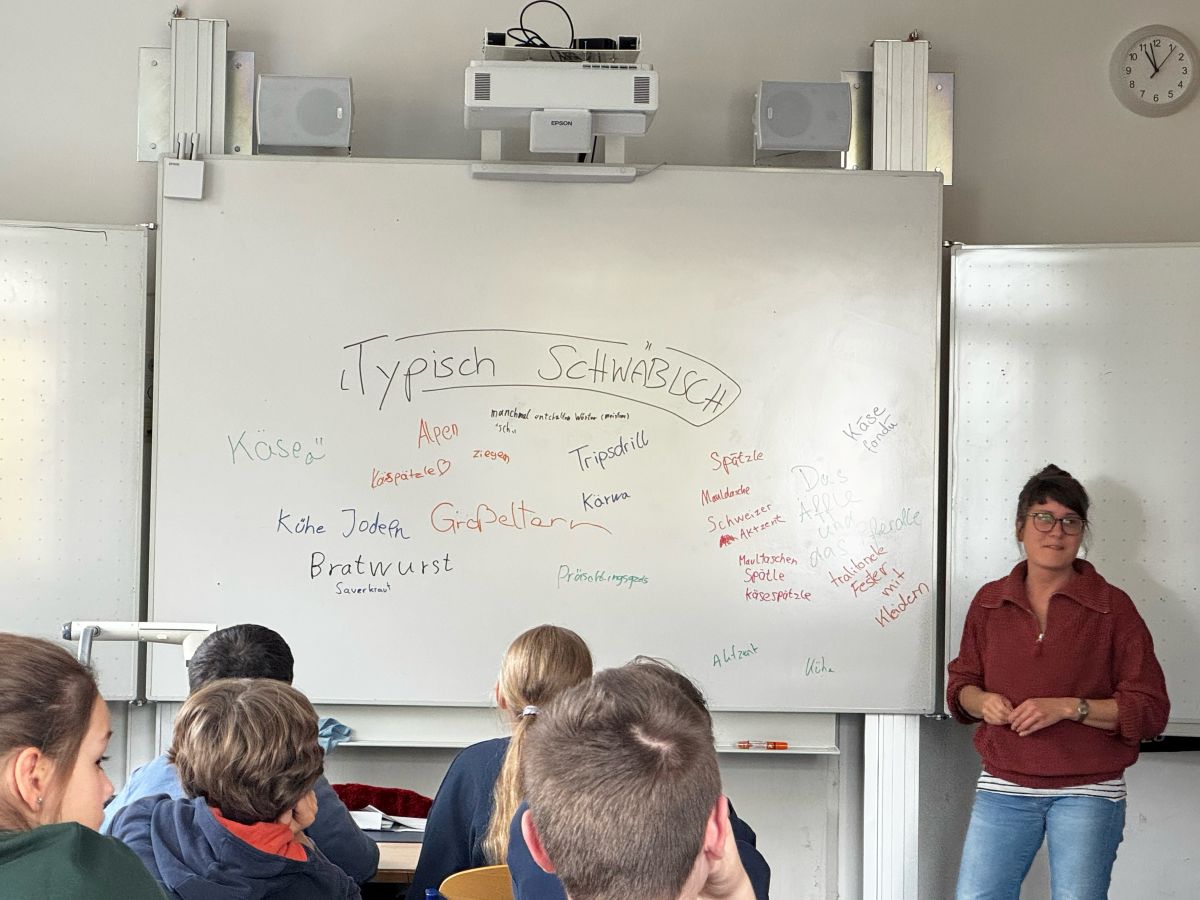 Gerade letzte Woche hat sie in Freiburg den Förderpreis des Kleinkunstwettbewerbs Baden-Württemberg entgegengenommen. Heute steht die schwäbische Liedermacherin Elena Seeger vor der Klasse 6a des GGS und bringt den Schülerinnen und Schülern bei, was „a Gugg“, „a Mugg“ oder „a Häs“ ist. Auch wenn nicht mal eine Hand voll Kinder in der Klasse Schwäbisch im Alltag hört geschweige denn spricht, ist ein spürbarer Bezug da und es gibt Wege, den Dialekt lebendig zu halten. Zu Beginn der Stunde schreibt die Klasse Begriffe an die Tafel, die sie für „typisch schwäbisch“ halten. Da steht natürlich „Kässpätzle“, „Kehrwoch“ und „Äffle und Pferdle“, aber auch die Assoziation „Großeltern“: Dialekt verbindet die Generationen.