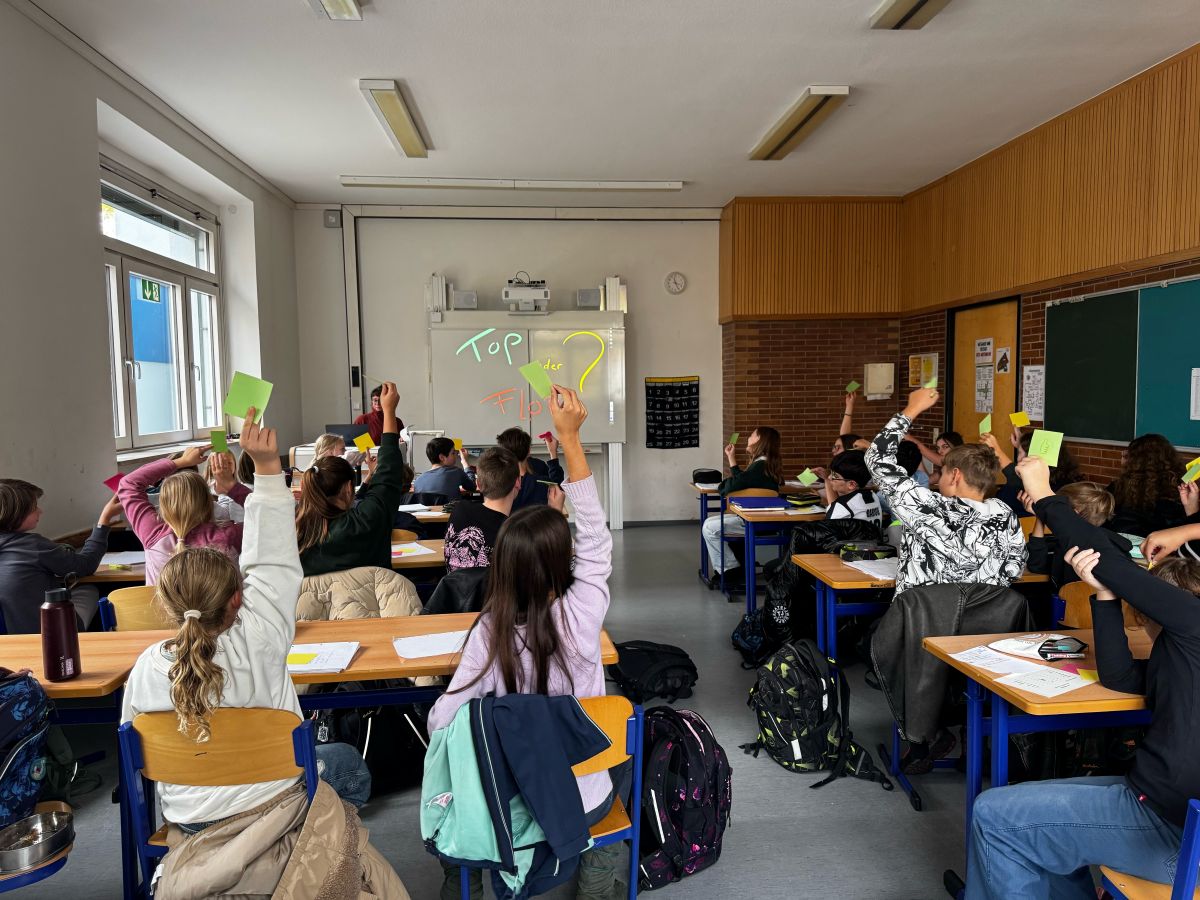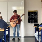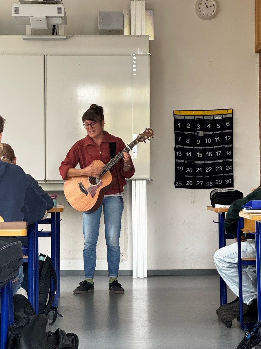 Elena Seeger greift nicht nur selbst zur Gitarre und singt für uns. Sie hat zudem ein paar schwäbische Kolleginnen und Kollegen mit im Gepäck, aus deren Liedern sie Ausschnitte vorspielt. Nach jeder Tonsequenz entscheidet die Klasse: „Top oder Flop?“ Ganz oben auf der Hitliste landen die „Gäumoggl“, dicht gefolgt von „MC Bruddaal“ und „Gässlesrap“. Schwäbische Musik kann durchaus modern sein. Nachdem sie einiges gehört haben, schreiben die Schülerinnen und Schüler am Ende selbst Liedstrophen auf Schwäbisch oder erfinden kleine Theatersequenzen. Auch das klappt auf Anhieb richtig gut.
